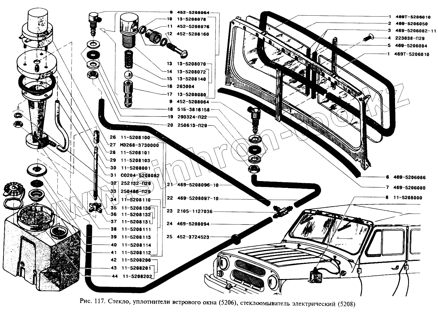 Каталог запасных частей к технике: УАЗ-3151. Стекло, уплотнители ветрового окна, стеклоомыватель электрический