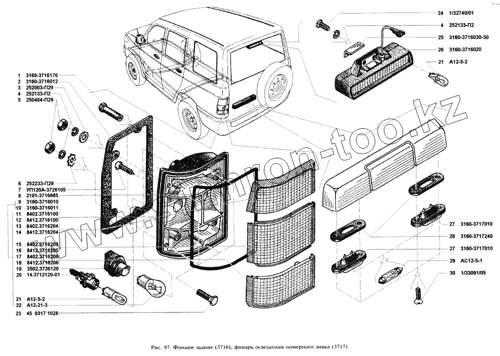 Каталог запасных частей к технике: УАЗ-3160. Фонари задние, фонарь освещения номерного знака