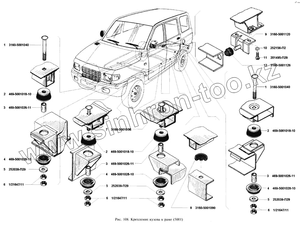 Каталог запасных частей к технике: УАЗ-3160. Крепление кузова к раме