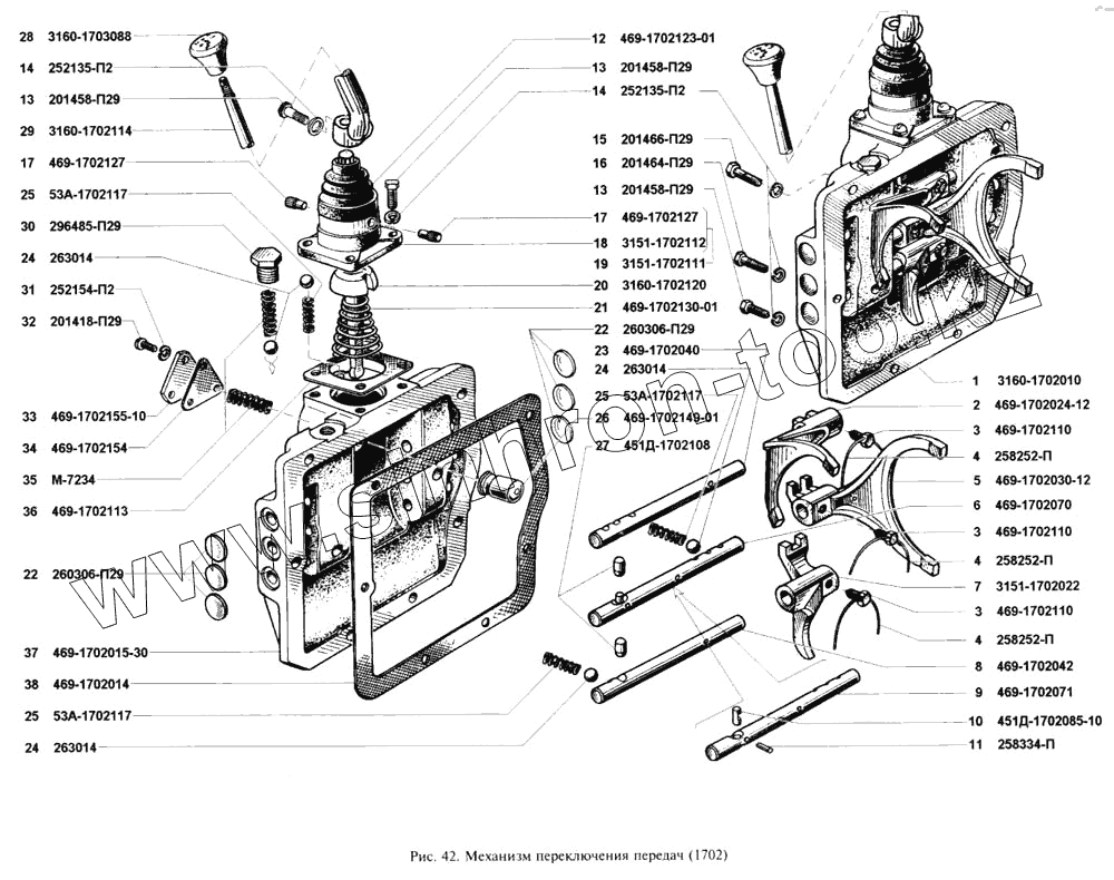 Каталог запасных частей к технике: УАЗ-3160. Механизм переключения передач (четырехступенчатой коробки)