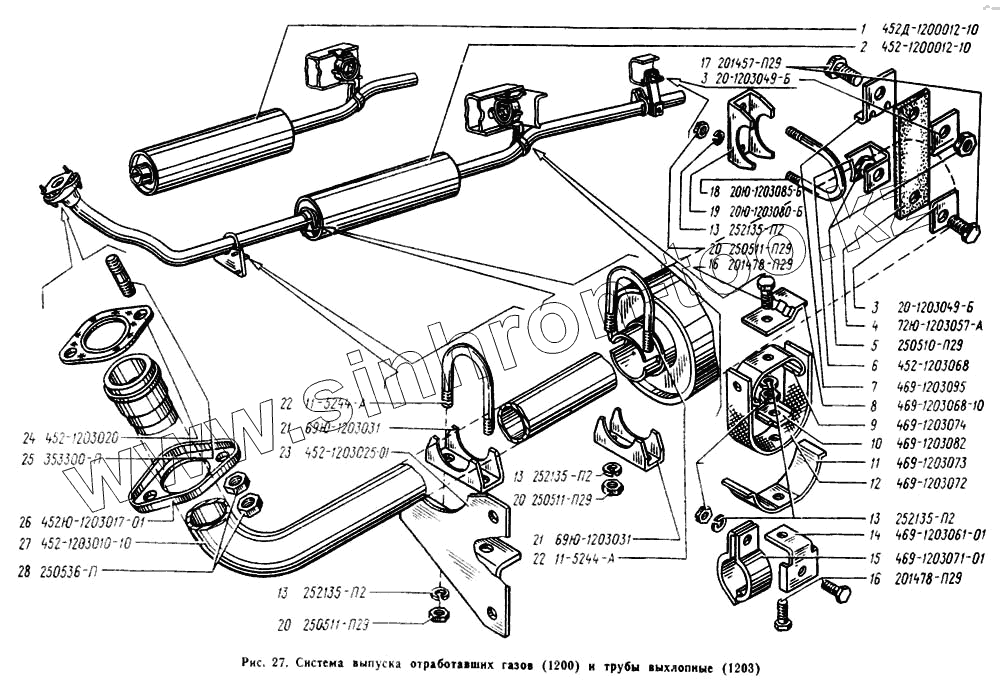 Каталог запасных частей к технике: УАЗ-3303. Система выпуска отработавших газов, трубы выхлопные