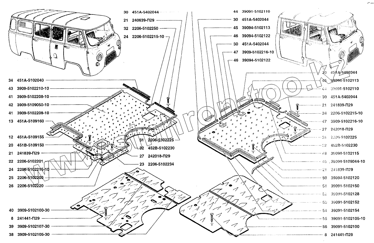 Каталог запасных частей к технике: УАЗ-37419. Настил и коврики пола