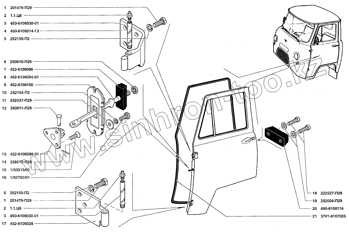 Каталог запасных частей к технике: УАЗ-37419. Навеска и уплотнитель передней двери