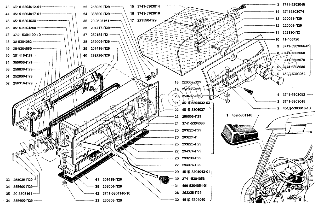 Каталог запасных частей к технике: УАЗ-37419. Передок, ящик вещевой, вентиляция передка