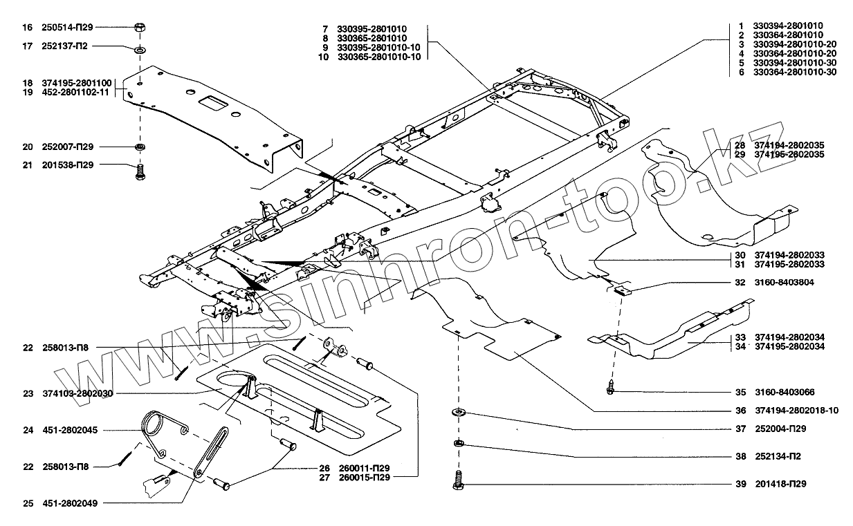 Каталог запасных частей к технике: УАЗ-37419. Рама, брызговики