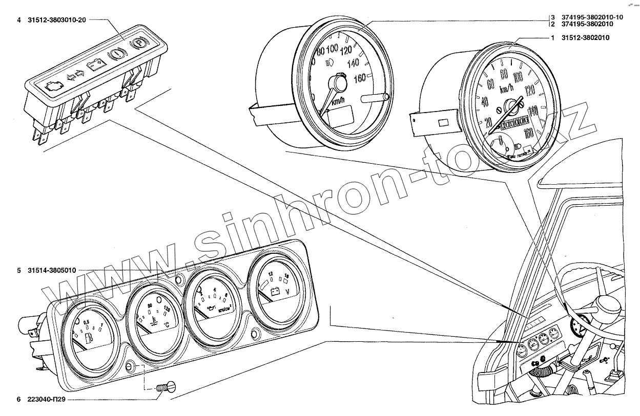 Каталог запасных частей к технике: УАЗ-37419. Спидометр, фонари контрольных ламп, щиток приборов