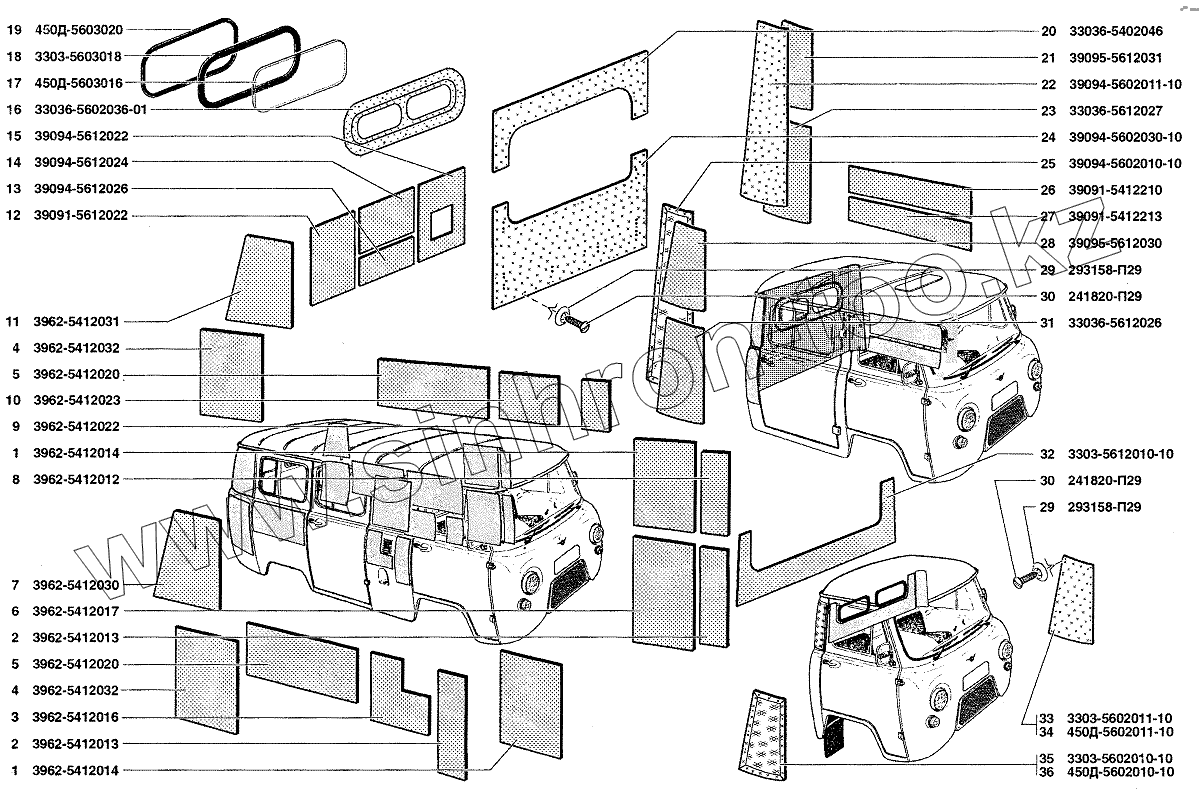 Каталог запасных частей к технике: УАЗ-37419. Термошумоизоляция боковины, обивка задка, окно задка