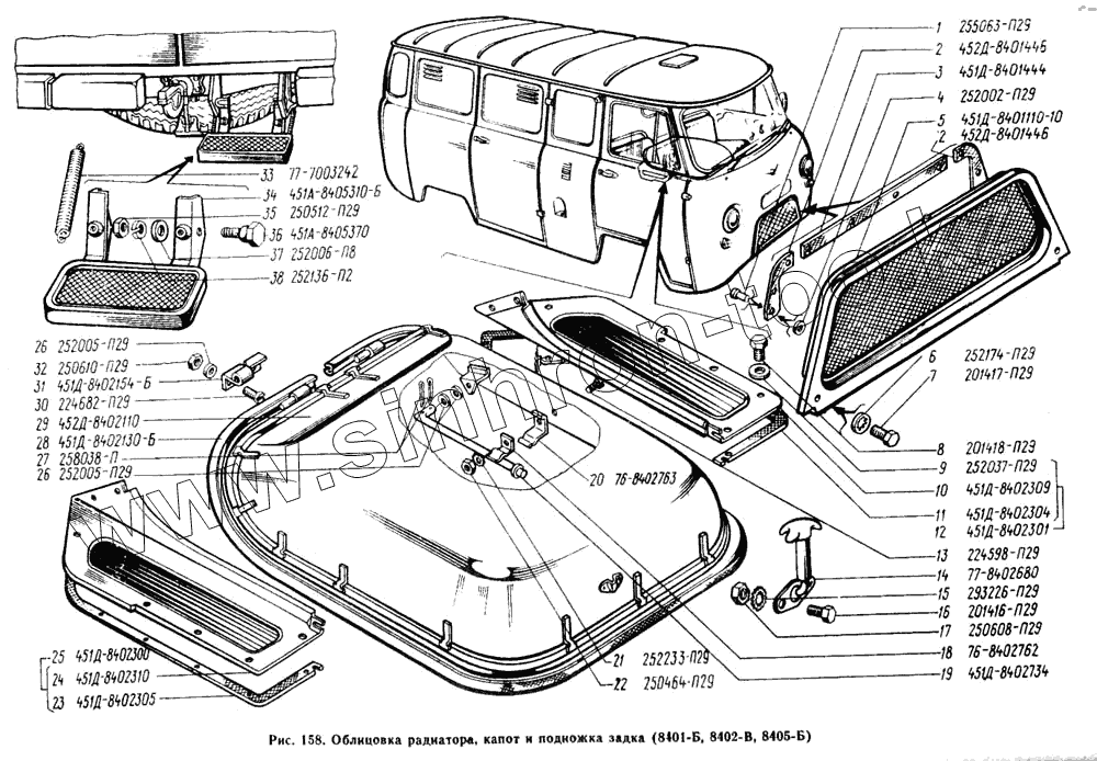 Каталог запасных частей к технике: УАЗ-3741. Облицовка радиатора, капот, подножка задка