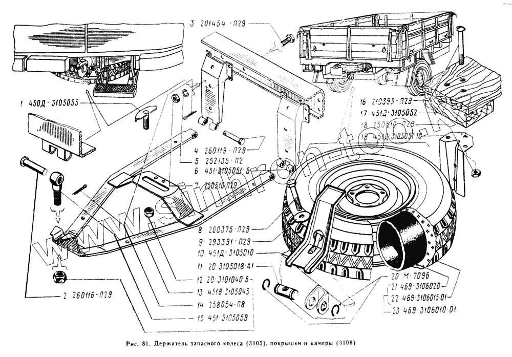 Каталог запасных частей к технике: УАЗ-3962. Держатель запасного колеса, покрышки и камеры