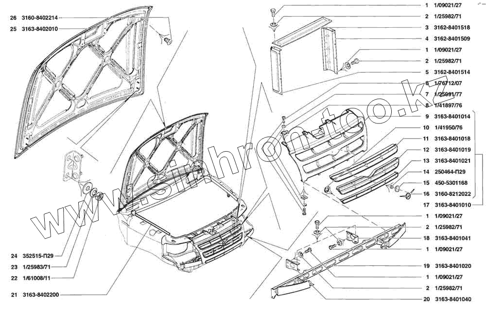 Каталог запасных частей к технике: УАЗ Patriot. Капот, облицовка радиатора