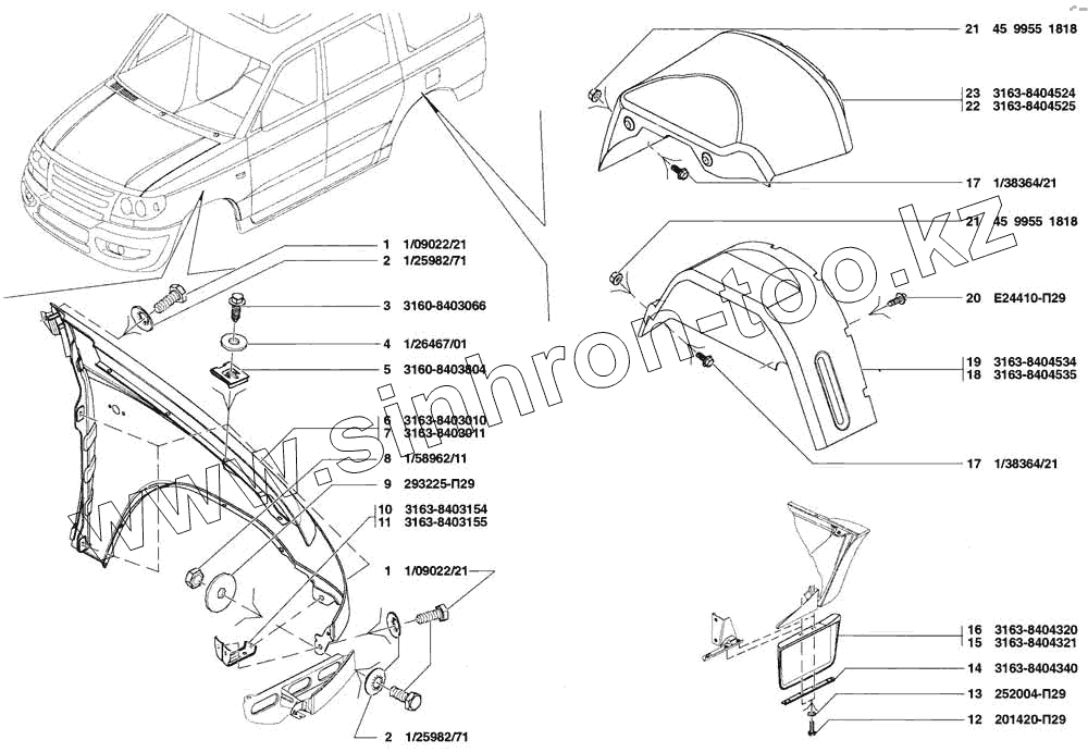 Каталог запасных частей к технике: УАЗ Patriot. Крыло переднее, фартуки