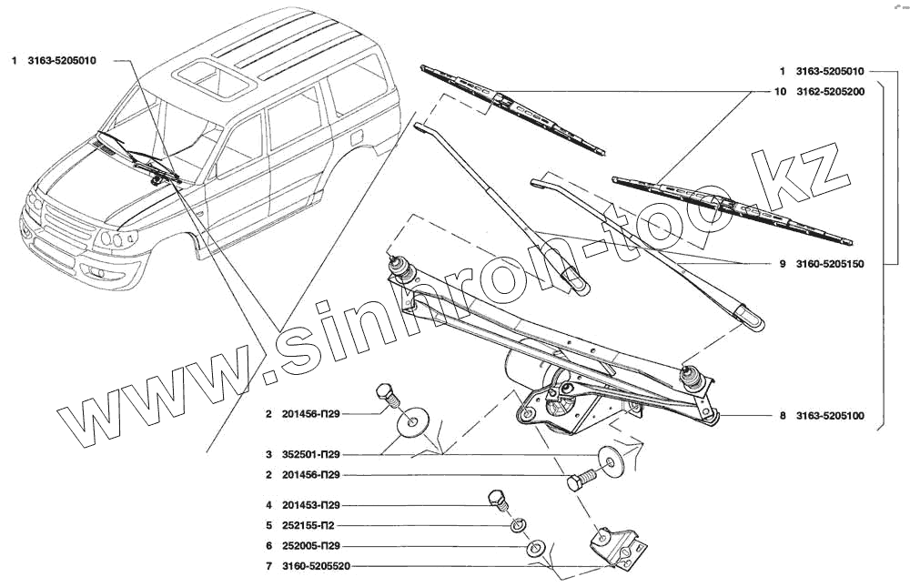 Каталог запасных частей к технике: УАЗ Patriot. Стеклоочиститель и привод