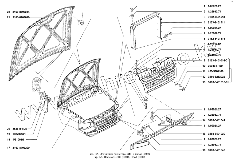 Каталог запасных частей к технике: УАЗ UAZ Patriot. Капот, облицовка радиатора