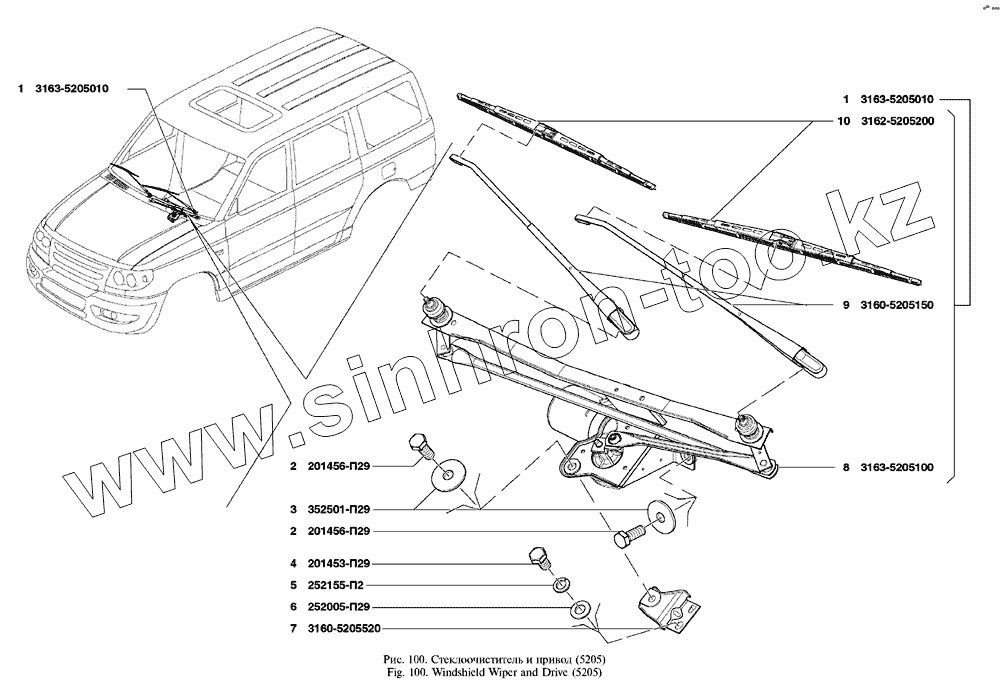Каталог запасных частей к технике: УАЗ UAZ Patriot. Стеклоочиститель и привод