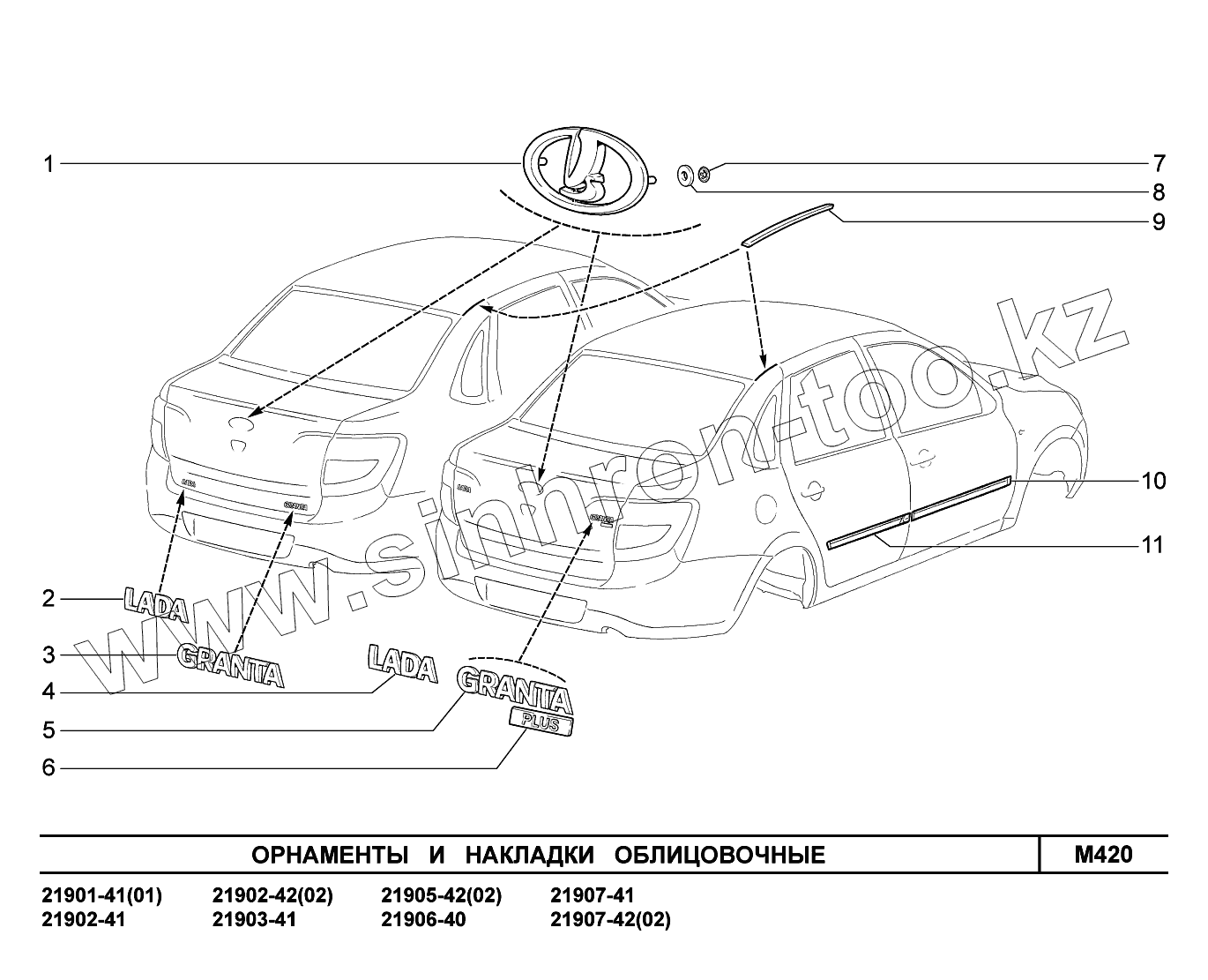 Каталог запасных частей к технике: ВАЗ LADA Granta 2190. M420. Орнаменты и накладки облицовочные