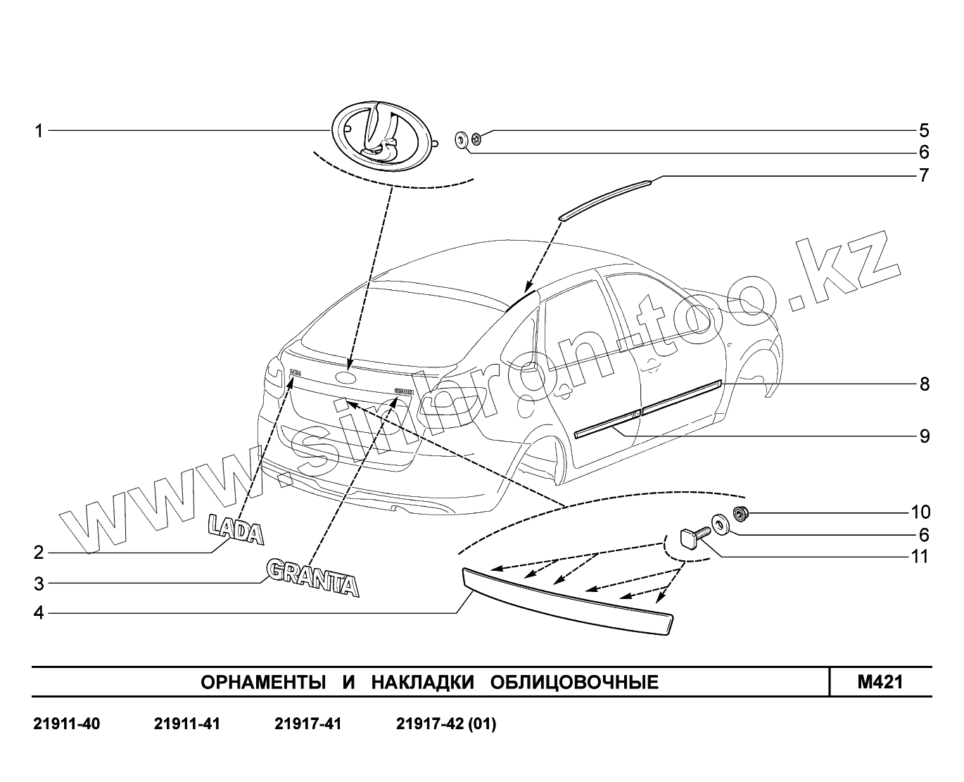 Каталог запасных частей к технике: ВАЗ LADA Granta 2190. M421. Орнаменты и накладки облицовочные