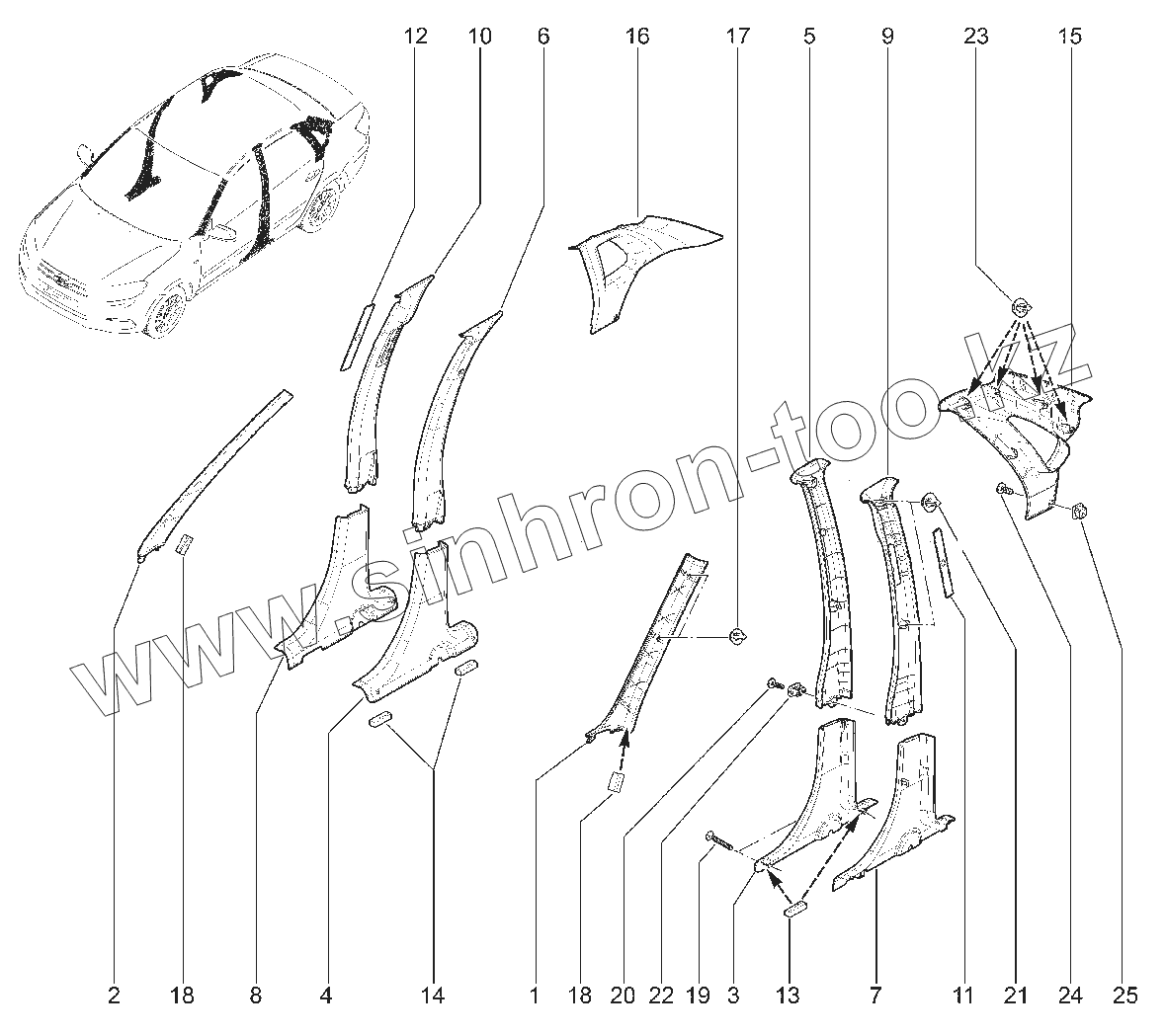 Каталог запасных частей к технике: ВАЗ LADA Granta 2190. 710111. НАКЛАДКИ СТОЕК (ВНУТРИСАЛОННЫЕ)