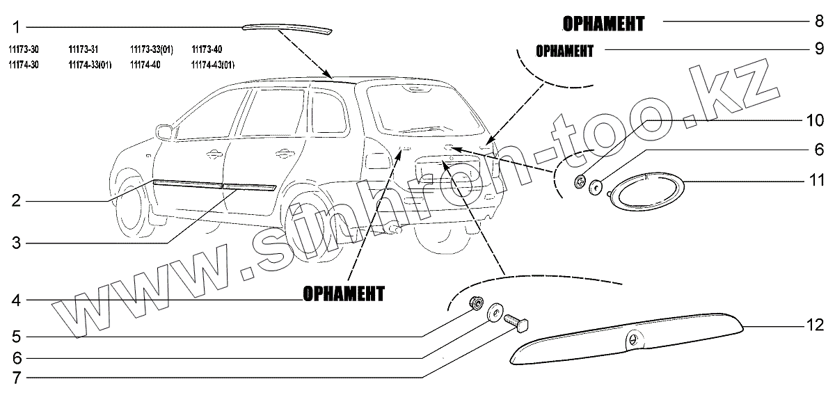 Каталог запасных частей к технике: ВАЗ LADA Kalina 1117. Орнаменты и накладки облицовочные