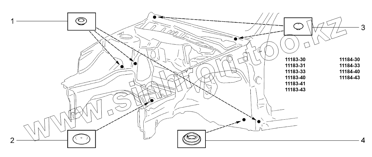 Каталог запасных частей к технике: ВАЗ LADA KALINA 1118. Схема установки заглушек;Plug Layout