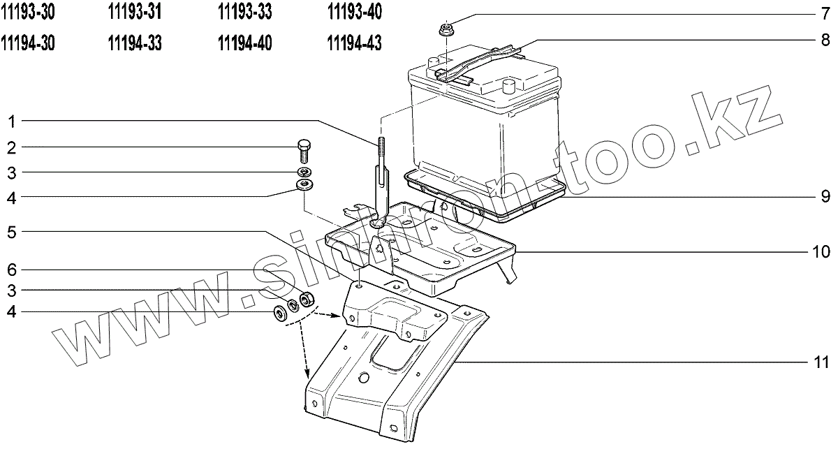 Каталог запасных частей к технике: ВАЗ LADA Kalina 1119. Установка батареи аккумуляторной