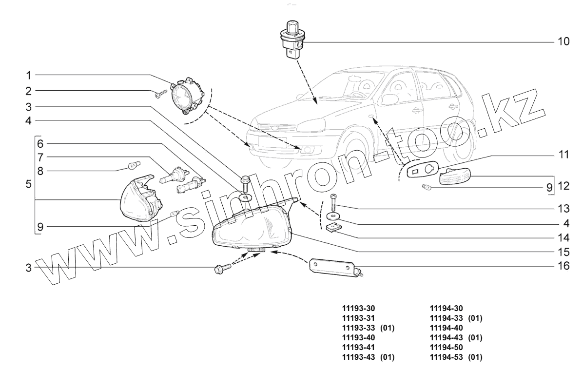 Каталог запасных частей к технике: ВАЗ LADA KALINA 1119. Освещение переднее;Front lights