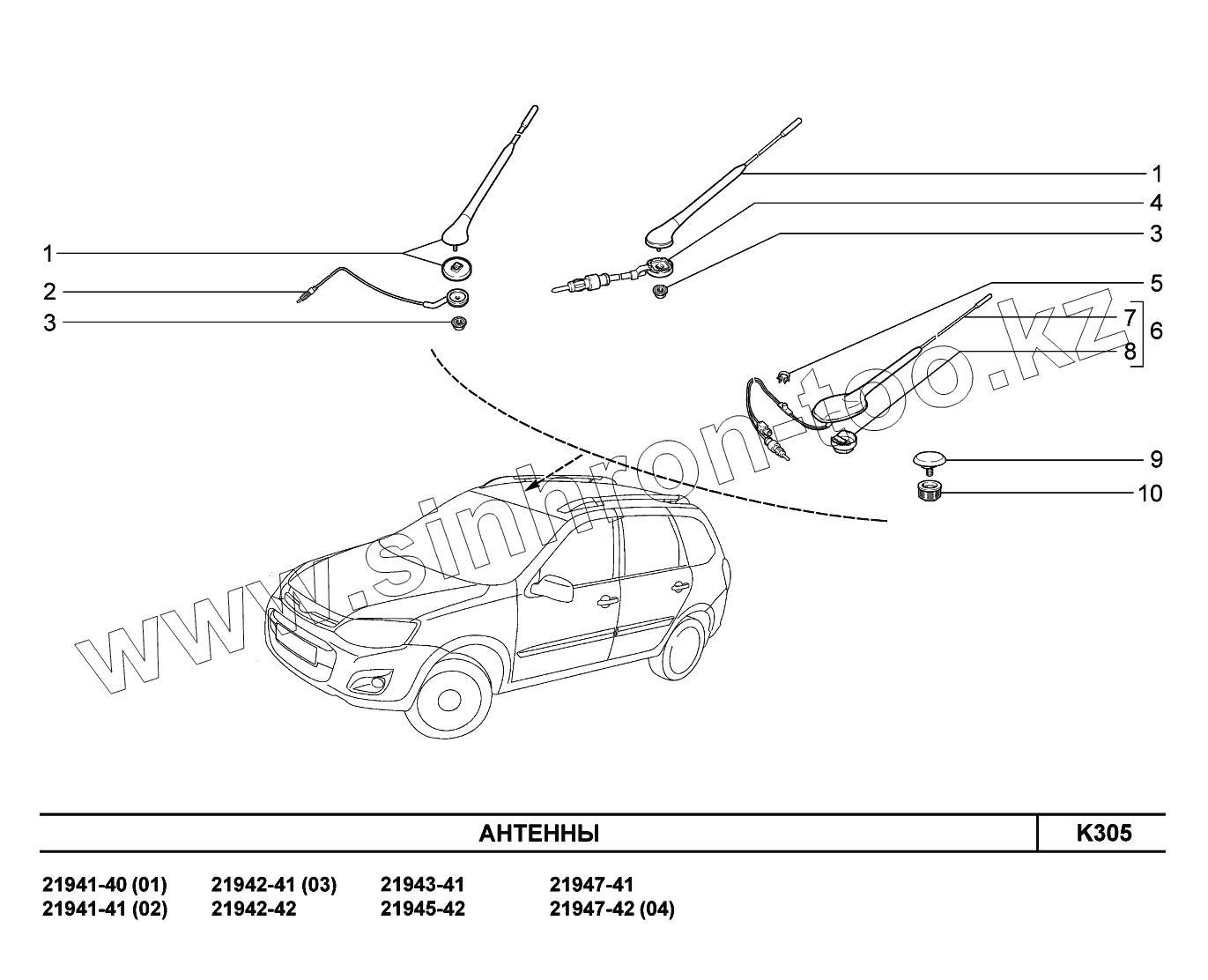 Каталог запасных частей к технике: ВАЗ LADA Kalina 2194. K305. Антенны
