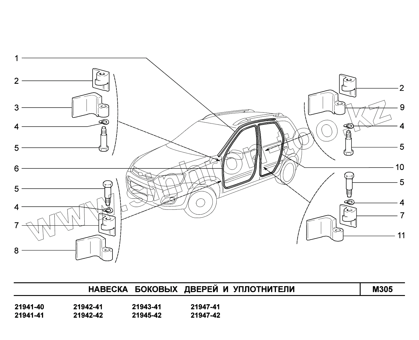 Каталог запасных частей к технике: ВАЗ LADA Kalina 2194. M305. Навеска боковых дверей и уплотнители