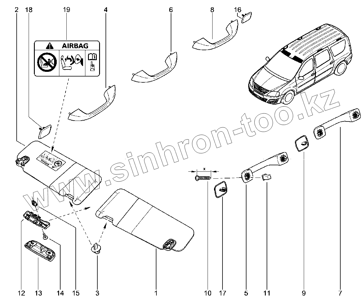 Каталог запасных частей к технике: ВАЗ LADA Largus. 542110. Поручни, козырьки, крючки
