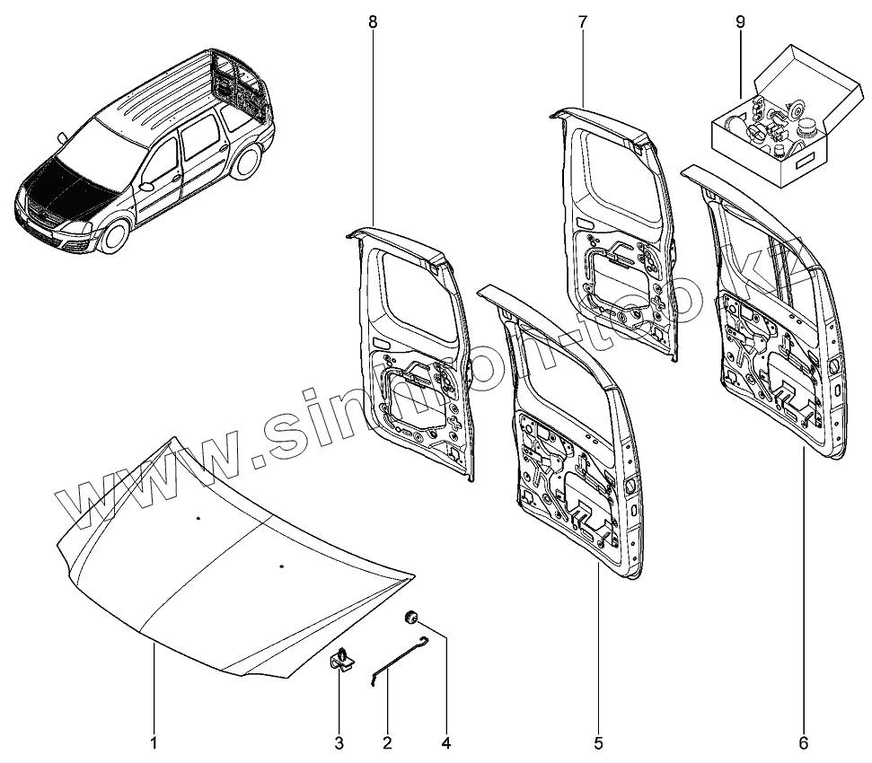 Каталог запасных частей к технике: ВАЗ LADA Largus 4601. Капот, двери задние