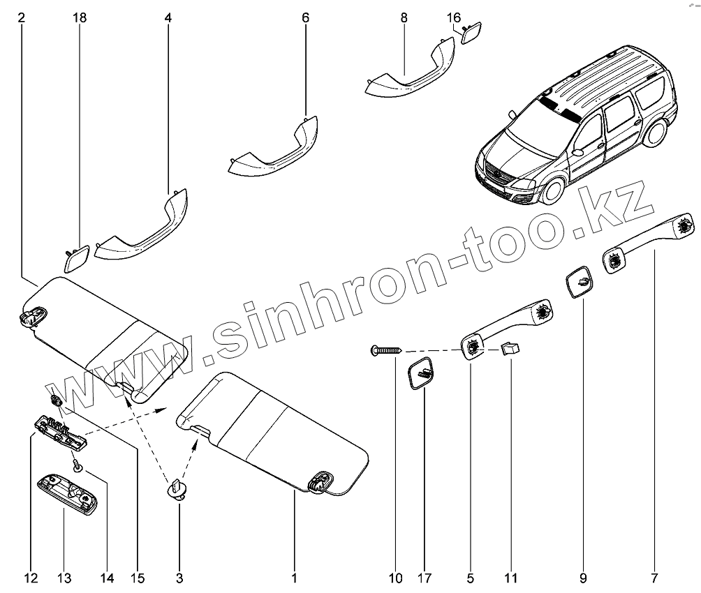 Каталог запасных частей к технике: ВАЗ LADA Largus 4601. Поручни, козырьки, ключки