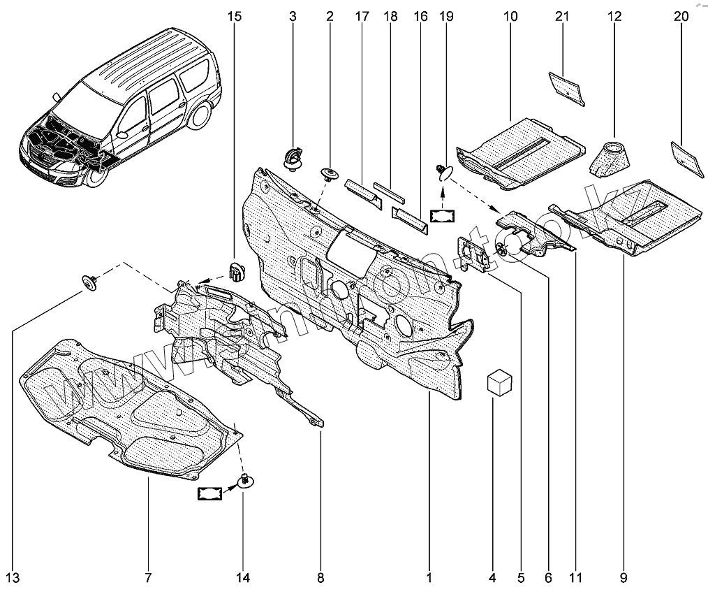 Каталог запасных частей к технике: ВАЗ LADA Largus 4601. Шумоизоляция подкапотная