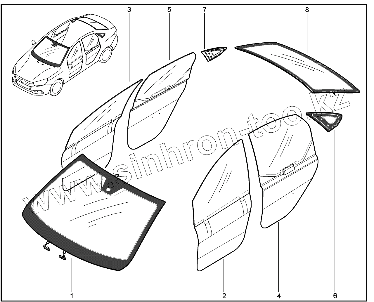 Каталог запасных частей к технике: ВАЗ LADA Vesta. 540110. Стекла (периметр кузова)