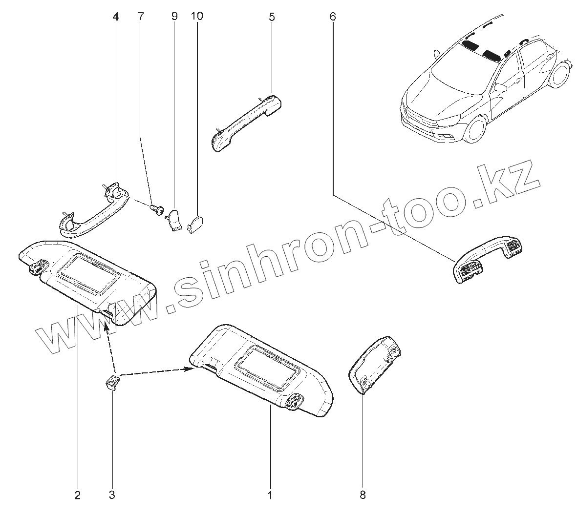 Каталог запасных частей к технике: ВАЗ LADA Vesta. 584010. КОЗЫРЬКИ, ПОРУЧНИ