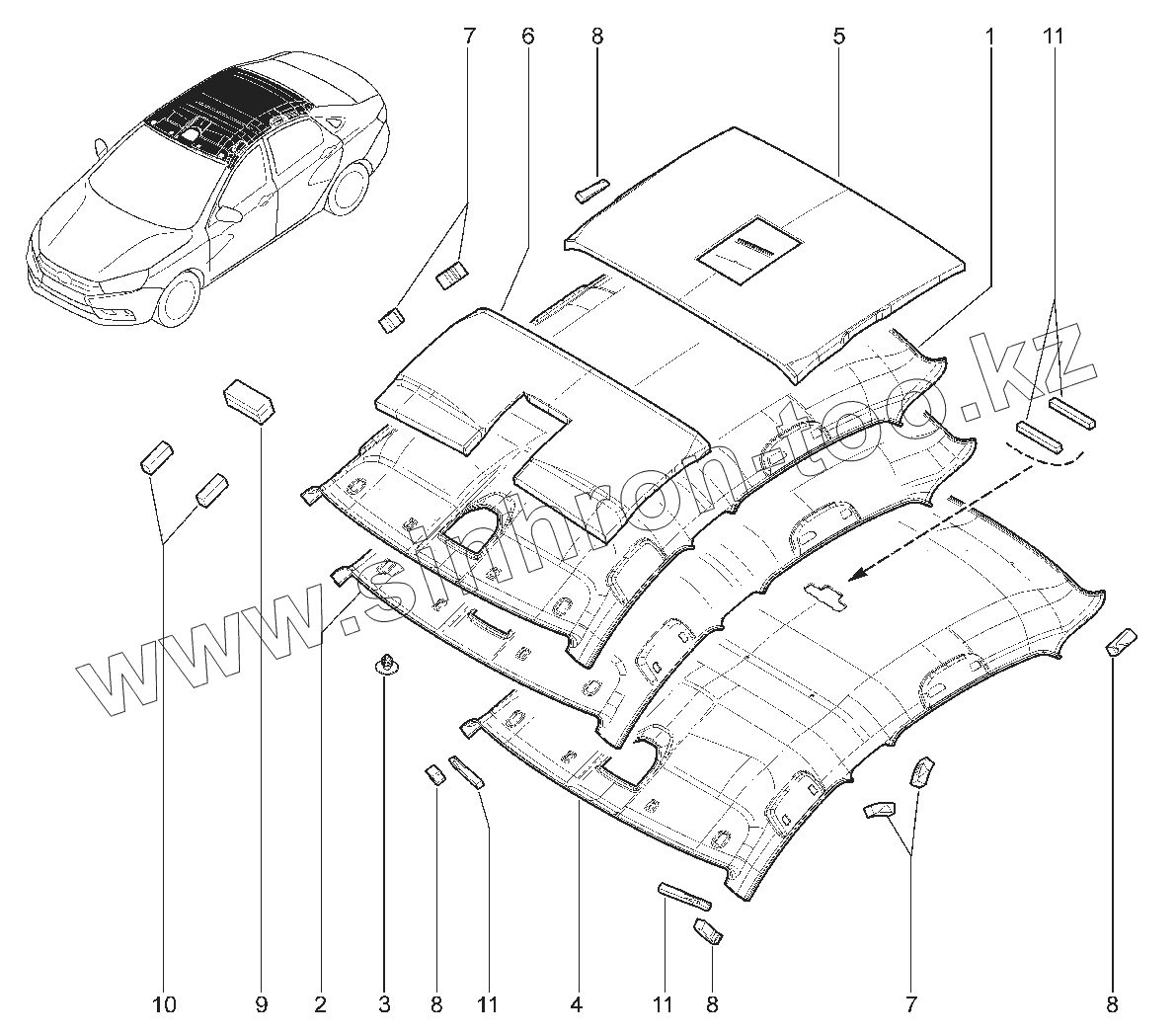 Каталог запасных частей к технике: ВАЗ LADA Vesta. 711011. ОБИВКА КРЫШИ (седан)