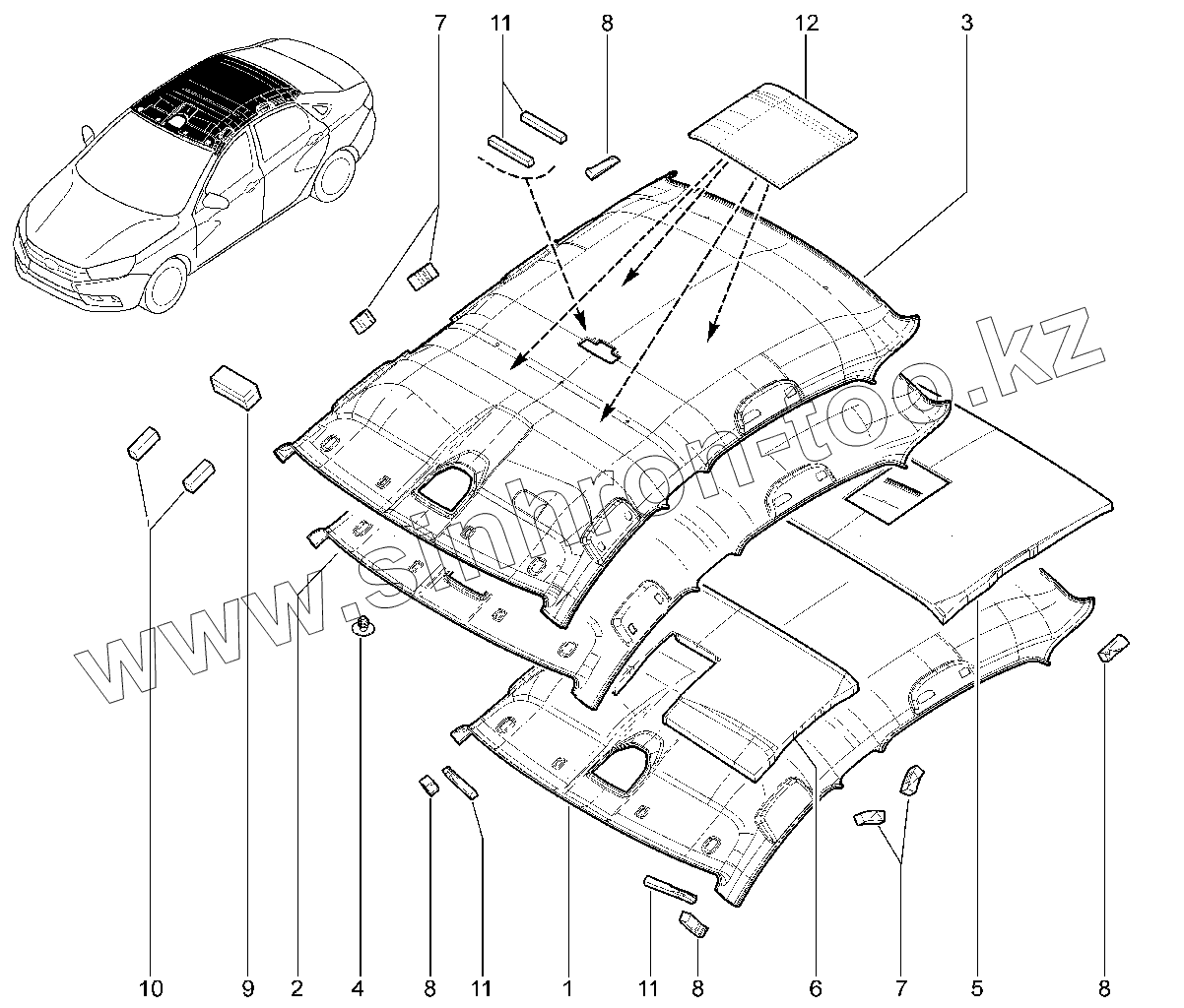 Каталог запасных частей к технике: ВАЗ LADA Vesta. 572110. Обивка крыши (седан)