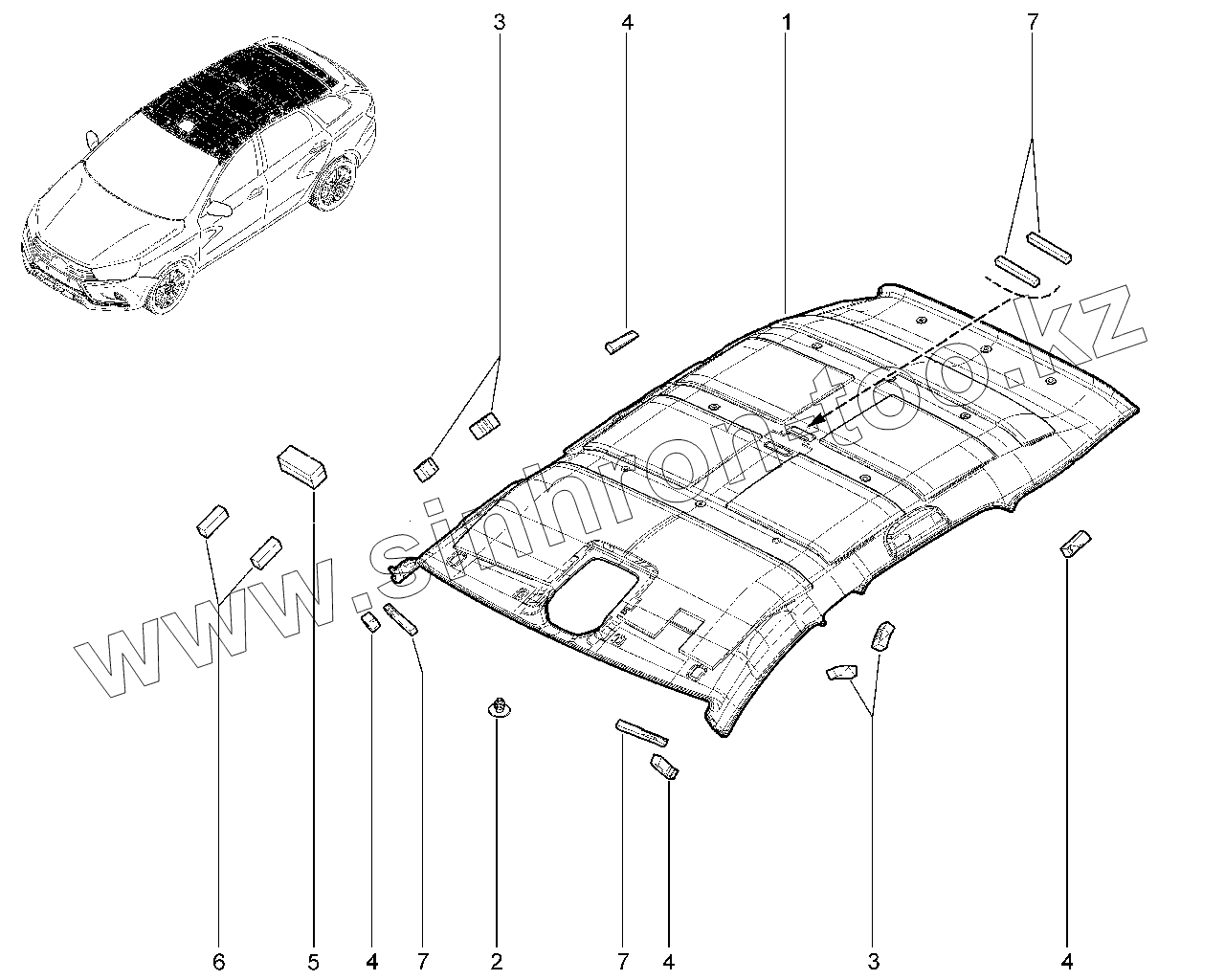 Каталог запасных частей к технике: ВАЗ LADA Vesta. 572410. Обивка крыши (универсал)(FL)