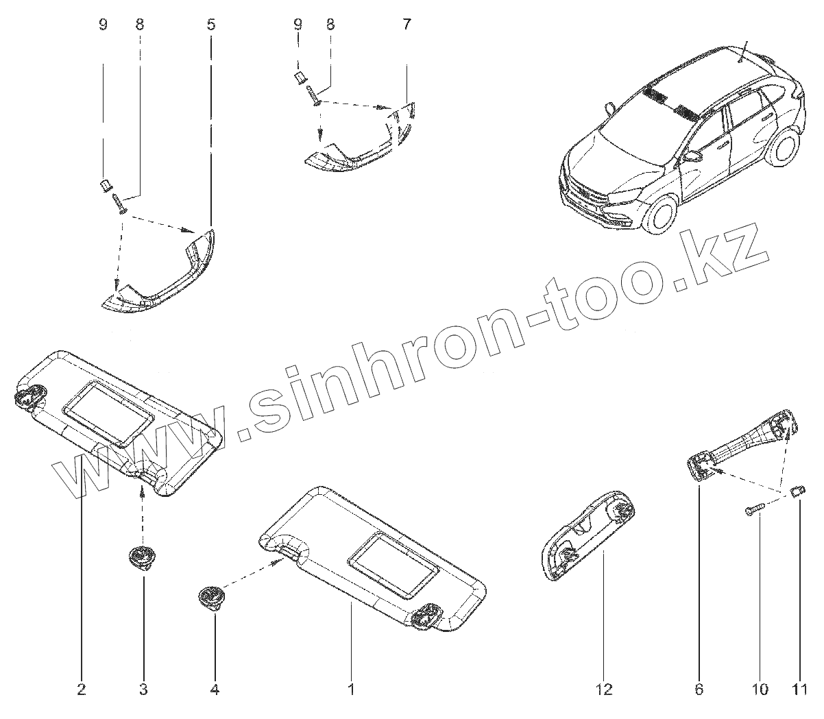 Каталог запасных частей к технике: ВАЗ LADA XRAY. 584010. ПОРУЧНИ, КОЗЫРЬКИ, КРЮЧКИ