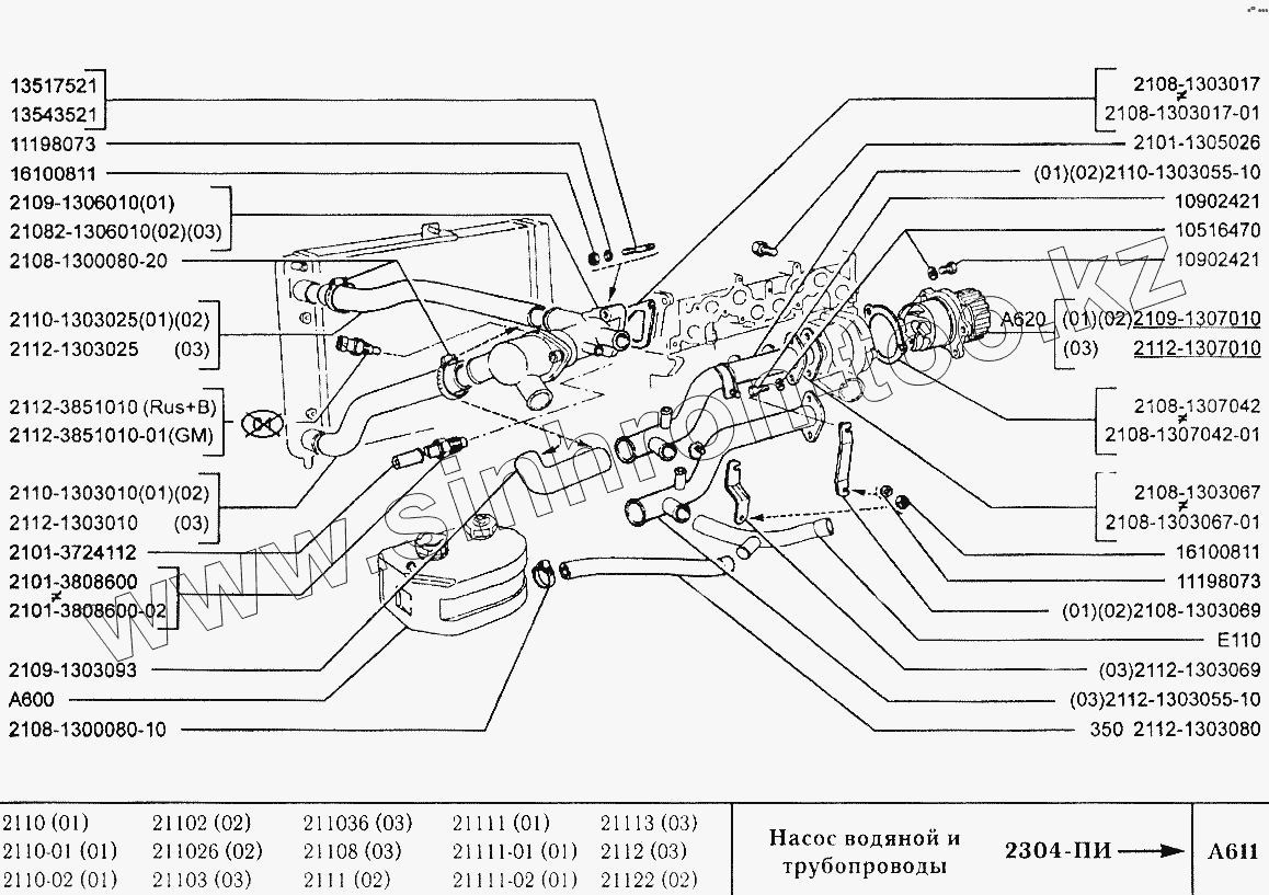 Каталог запасных частей к технике: ВАЗ-2110. Насос водяной и трубопроводы