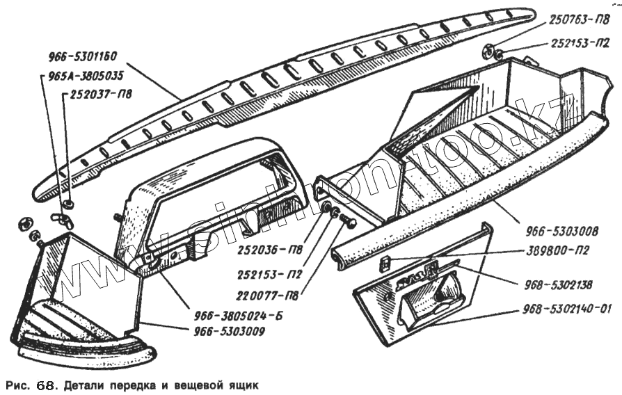 Каталог запасных частей к технике: ЗАЗ 968. Детали передка и вещевой ящик
