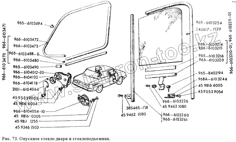 Каталог запасных частей к технике: ЗАЗ 968М. Опускное стекло двери и стеклоподъемник