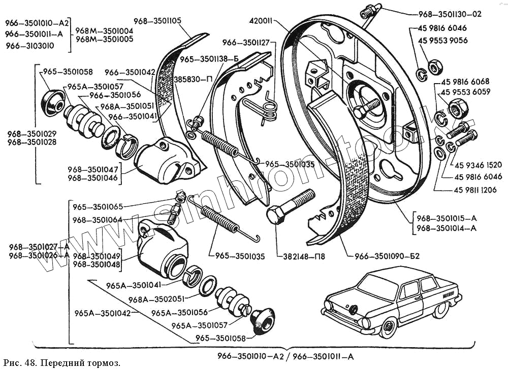 Каталог запасных частей к технике: ЗАЗ 968М. Передний тормоз