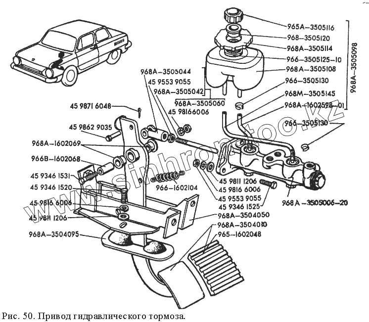 Каталог запасных частей к технике: ЗАЗ 968М. Привод гидравлического тормоза