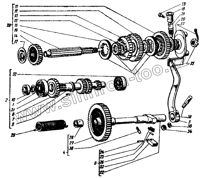 Каталог запасных частей к технике: ИМЗ Урал М-67-36. Валы и шестерни коробки передач