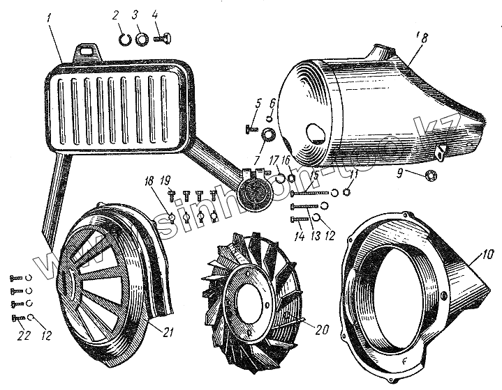 Каталог запасных частей к технике: ВПМЗ ВП-150 "Вятка". Глушитель и детали охлаждения двигателя