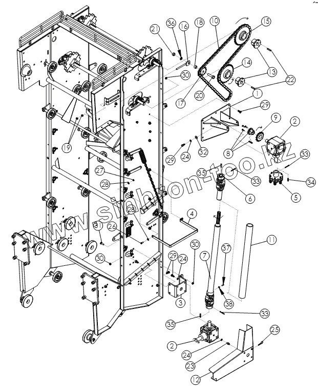 Каталог запасных частей к технике: Amity-2007 WIC 6 row. Привод заднего очистителя, редуктор