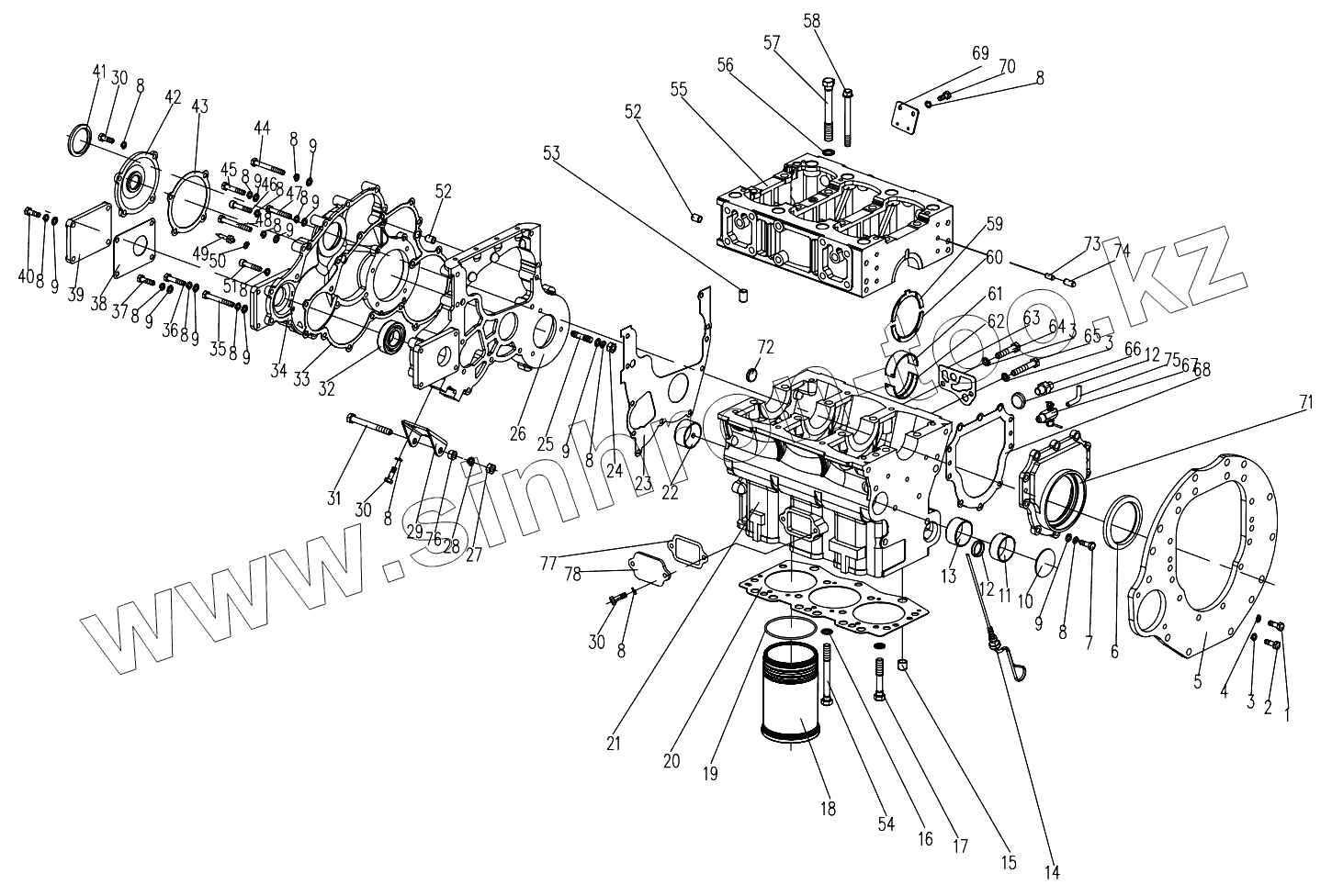 Каталог запасных частей к технике: DongFeng 254G2. Cylinder Block and Gear Case Assembly
