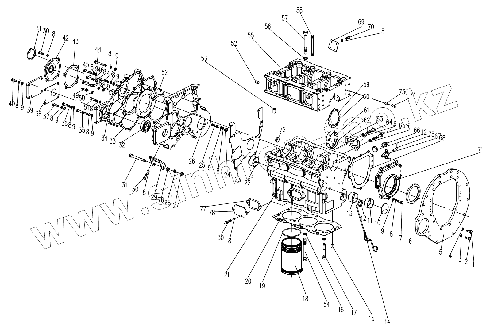 Каталог запасных частей к технике: DongFeng 304EC. Cylinder Block and Gear Case Assembly