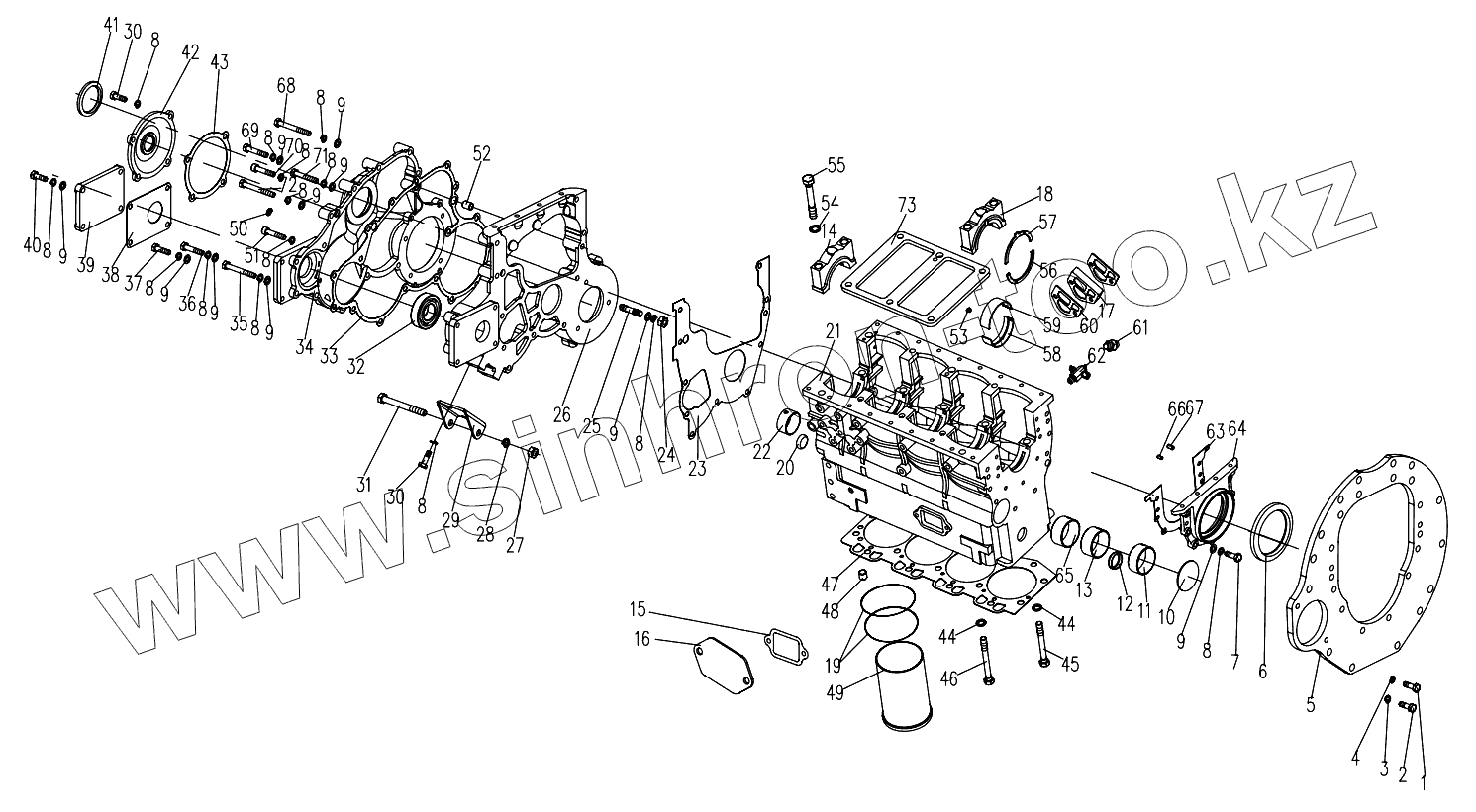 Каталог запасных частей к технике: DongFeng 404CE. Cylinder Block and Gear Case Assembly