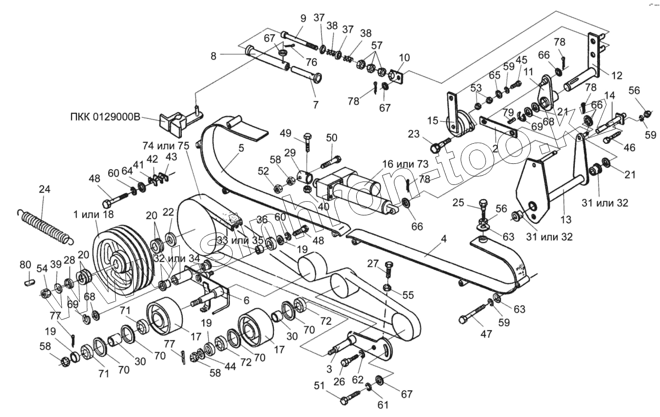 Каталог запасных частей к технике: Гомсельмаш КПК-3000А (Палессе FH40A). Шкивы, ограждения привода ротора измельчителя