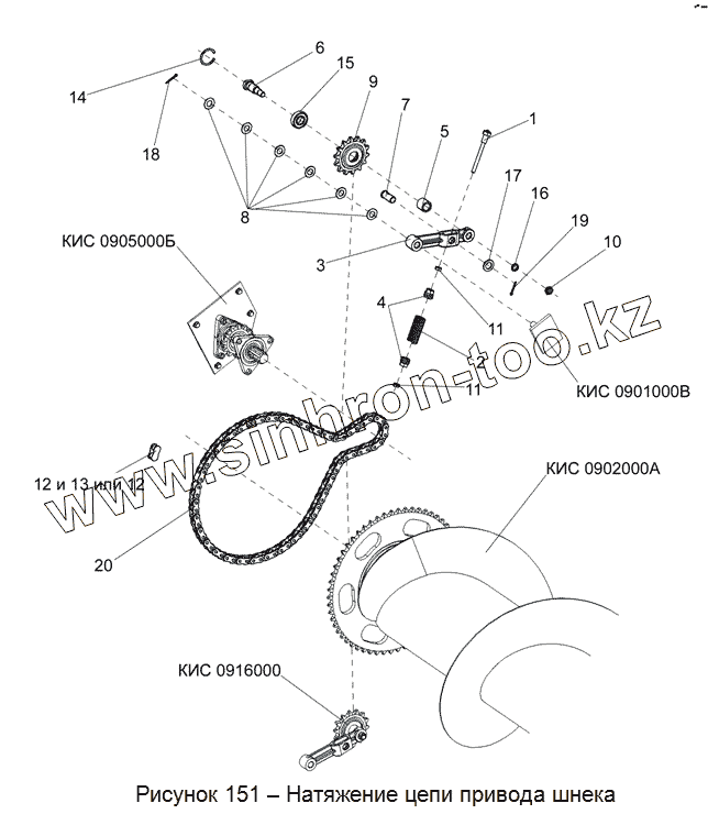 Каталог запасных частей к технике: Гомсельмаш КСК-100А-3. Натяжение цепи привода шнека